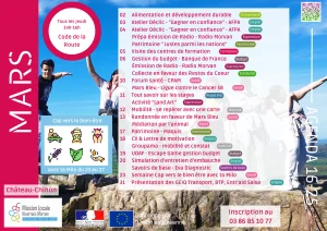 Le programme d’ateliers du Contrat d’Engagement Jeune de Mars 2026 est disponible ! Le programme d’ateliers du Contrat Engagement Jeune de la Mission Locale Nivernais Morvan débarque.A noter que le vendredi 13 mars, dans le cadre de la lutte contre le cancer colorectal, les jeunes de la Milo vous proposeront une Marche Bleue : un …